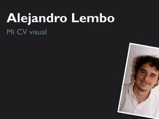 Este documento es el CV visual de Alejandro Lembo. Resume su educación y experiencia laboral, incluyendo haber asistido a la escuela secundaria Pellegrini, trabajar como cajero en un restaurante en EEUU, trabajar para Dupont y Telefónica, obtener un posgrado en la Universidad de San Andrés, hacer un MBA en España, y hacerse cargo del e-commerce de Movistar. También enseña en varias universidades y comparte sus intereses en su blog.