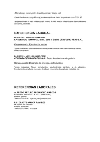 Este documento presenta el currículum vitae de Amner Enrique Cortegana Perez, un ingeniero civil peruano de 24 años que actualmente cursa el décimo ciclo de la carrera de Ingeniería Civil en la Universidad Nacional de Ingeniería en Lima, Perú. Detalla su experiencia laboral en proyectos estructurales y ventas, así como sus habilidades en software de ingeniería, dibujo y metrados.