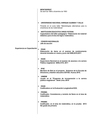 Este documento presenta el currículum vitae de Alicia Becerra López. Se detalla que es profesora de educación secundaria especializada en matemáticas, con estudios de maestría y licenciatura. Ha trabajado como profesora en varias instituciones educativas desde 1989. También ha impartido capacitaciones y ha participado en la elaboración de exámenes. Ha tomado numerosos cursos y seminarios para su desarrollo profesional.