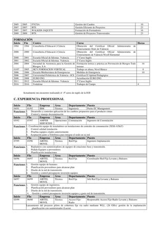 El documento resume la formación y experiencia profesional de Daniel Ángel Valle Algarra. Detalla su educación técnica e ingeniería industrial, así como numerosos cursos de telecomunicaciones, gestión, idiomas e inglés. Su experiencia laboral incluye puestos en IBM, AMPER, Airtel Móvil y Vodafone en áreas como conmutación, red fija, acceso a clientes y diseño e ingeniería de red. Actualmente trabaja como especialista de diseño e ingeniería en Vodafone.