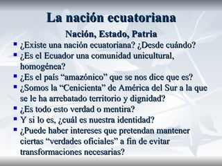 El documento discute la identidad nacional ecuatoriana y las relaciones entre el estado y la nación. Explica que las naciones son construcciones históricas que surgen de las comunidades políticas modernas, mientras que los estados proveen la base jurídica y territorial. Aunque los estados buscan homogeneizar las sociedades, también existen diversidad y pluralismo cultural. Los estados-nación más sólidos son aquellos que logran incorporar aspectos profundos de las culturas populares en la identidad nacional, a pesar de las diferencias internas.