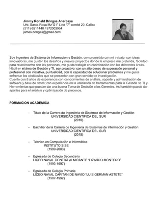 Jimmy Ronald Bringas Anarcaya es un ingeniero de sistemas de información y gestión con 8 años de experiencia en análisis, soporte y administración de software y bases de datos. Ha trabajado como consultor de TI, jefe de área de TI, gestor de proyectos, soporte técnico y desarrollo de sistemas. Posee una maestría en ingeniería de sistemas de información y gestión de la Universidad Científica del Sur y certificaciones en varias herramientas y sistemas de TI.