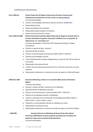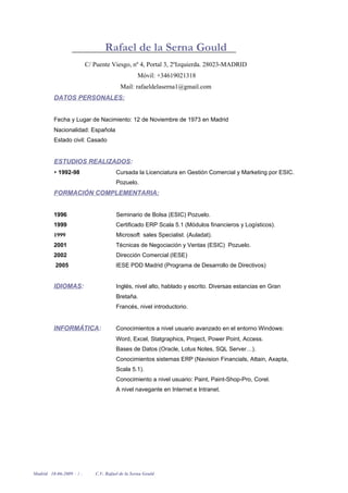 Rafael de la Serna Gould tiene una amplia experiencia profesional en cargos directivos en empresas del sector de la tecnología y la informática. Estudió una licenciatura en gestión comercial y marketing y posee varios certificados complementarios. Habla inglés a un nivel alto y francés a nivel introductorio. Actualmente es Director de Desarrollo de Negocio Internacional en una empresa líder en implantaciones de sistemas de gestión. Anteriormente ocupó cargos directivos en otras empresas del sector como Director Comercial Corporativo y Gerente de Marketing y