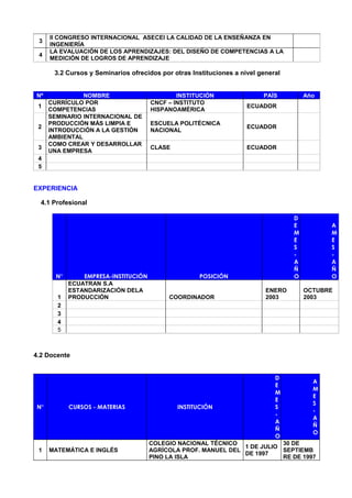 Este documento es la hoja de vida de Carlos Mesías Bejarano Naula, que incluye sus datos personales, formación académica, experiencia profesional y docente, publicaciones, idiomas, áreas de colaboración y declaración. Bejarano ha trabajado como docente universitario por 9 años y se ofrece a colaborar en diferentes áreas de la Facultad de Ingeniería de la Universidad Nacional de Chimborazo.