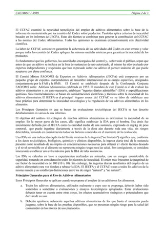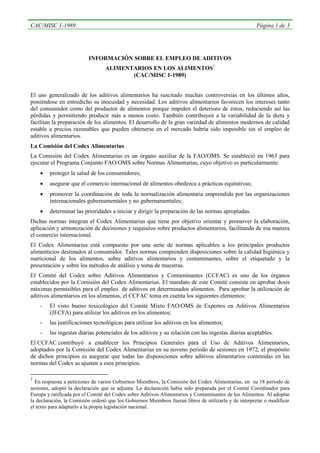 Este documento describe el trabajo de la Comisión del Codex Alimentarius y su Comité sobre Aditivos Alimentarios y Contaminantes para establecer normas sobre el uso seguro de aditivos alimentarios. La Comisión del Codex Alimentarius fue creada por la FAO y la OMS para proteger la salud de los consumidores y asegurar prácticas equitativas en el comercio internacional de alimentos. El Comité sobre Aditivos Alimentarios aprueba dosis máximas para aditivos alimentarios basándose en evaluaciones toxicológicas