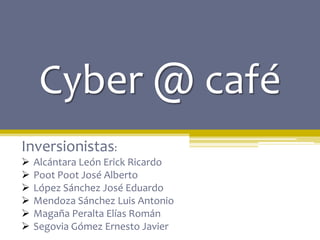 El documento presenta los detalles de un proyecto para establecer un café internet llamado "Cyber @ café", incluyendo a los 6 inversionistas, las características del local y equipamiento, la topología de red, software y hardware requeridos, costos de administración, mantenimiento y componentes, con un costo total estimado de $212,996.