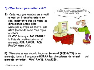 Este documento ofrece consejos sobre cómo evitar y combatir el spam. Recomienda usar CCO al enviar correos masivos para ocultar las direcciones, borrar direcciones de correos anteriores al reenviar, no responder a correos "remove" ni abrir archivos adjuntos sospechosos. También aconseja reportar spam a los dominios de origen y no comprar nada a los que envían spam.