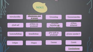 El documento describe el fenómeno del ciberacoso o ciberbullying. Explica que aproximadamente el 40% de los estudiantes han tenido algún contacto con el ciberbullying y que uno de cada cuatro está involucrado. También señala que el 50% de las víctimas no comunican sobre el problema, lo que aumenta el riesgo de ser ciberacosados nuevamente. Las consecuencias más graves incluyen depresión e ideación suicida.