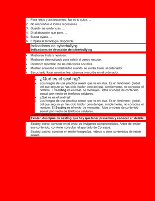 El documento define el cyberbullying como el uso de redes sociales para acosar a personas mediante ataques personales o divulgación de información confidencial o falsa. Explica algunos indicadores de cyberbullying como tristeza, desmotivación o ansiedad al usar el ordenador. También define el sexting como el envío de mensajes, fotos o videos de contenido sexual a través de teléfonos celulares, y menciona dos tipos: activo que implica enviar dicho contenido, y pasivo que implica recibirlo.