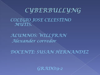 Este documento describe el bullying y el ciberbullying. Define el bullying como actos agresivos repetidos contra una víctima que no puede defenderse. Explica que el ciberbullying incluye acoso a través de mensajes, publicaciones en línea y sitios web dañinos. También identifica siete categorías de ciberbullying como flaming, acoso en línea, ciberacecho, denigración, suplantación de identidad, revelación de secretos y exclusión. El documento compara el bullying tradicional con el ciberbullying y explica cómo este último puede a