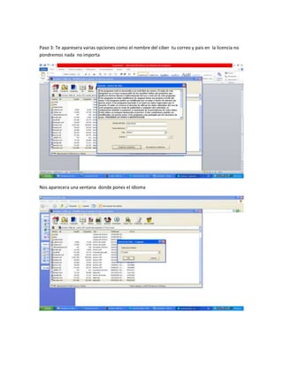 El documento proporciona instrucciones para instalar y configurar un programa de cibercontrol. Explica los pasos para descomprimir e instalar el programa, seleccionar el idioma y acceder al menú principal. Luego describe varias opciones de configuración como establecer un período de "hora feliz" con tarifas reducidas, bloquear y desbloquear funciones de los usuarios, y programar avisos y cortes de sesión.