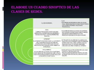 El documento resume las características de diferentes tipos de redes, incluyendo LAN, MAN, WAN e inalámbricas. También discute la importancia de Internet al permitir una comunicación integrada entre redes heterogéneas a través de protocolos de comunicación abiertos.