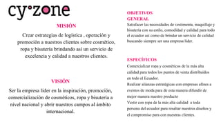 El documento presenta los objetivos generales, la visión y la misión de una empresa dedicada a la venta de ropa, cosméticos y bisutería en Ecuador. Los objetivos generales son satisfacer las necesidades de los clientes ecuatorianos con estilo, comodidad y calidad, y ser líderes en el mercado. La visión es ser la empresa líder a nivel nacional e internacional en la promoción de estos productos. La misión es crear estrategias logísticas y de promoción para brindar un excelente servicio a los clientes.