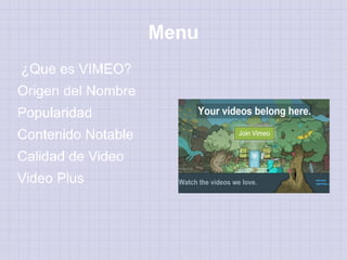 Vimeo es una red social para compartir y almacenar videos digitales. Los usuarios pueden subir, comentar y crear listas de favoritos de videos. Vimeo se ha vuelto popular entre artistas e incluso políticos para promover su contenido. La plataforma ofrece alta calidad de video, incluyendo soporte para videos HD, aunque las cuentas gratuitas tienen límites en el almacenamiento y calidad de videos.