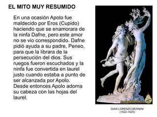 Este documento resume el mito griego de Apolo y Dafne. Narra cómo Apolo se enamoró de la ninfa Dafne pero ella no correspondía su amor. Para escapar de Apolo, Dafne pidió ayuda a su padre Peneo y fue transformada en un laurel. Desde entonces, Apolo usa las hojas de laurel para adornar su cabeza en honor a Dafne. El mito ha inspirado muchas obras literarias y artísticas a través de los siglos.