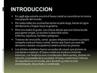 El documento resume la historia del heavy metal desde sus orígenes hasta la actualidad. Comenzó siendo muy criticado y estereotipado como música para delincuentes, pero ha ganado millones de seguidores. Se mencionan varios géneros y bandas importantes como Metallica, Slayer, Pantera y Slipknot. También habla sobre la identidad del fanático del metal y cómo el género ha evolucionado con el tiempo.