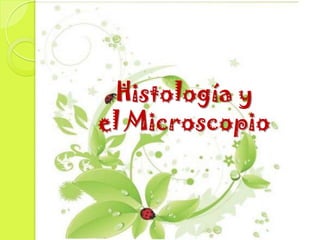Este documento presenta información sobre la histología y los diferentes tipos de microscopios. Explica brevemente que la histología estudia el cuerpo humano a nivel celular y de tejidos usando el microscopio como instrumento principal. Luego describe las partes ópticas y mecánicas básicas de un microscopio óptico simple y los diferentes tipos de microscopios como el fluorescente, de luz polarizada, digital, electrónico de transmisión y de barrido.
