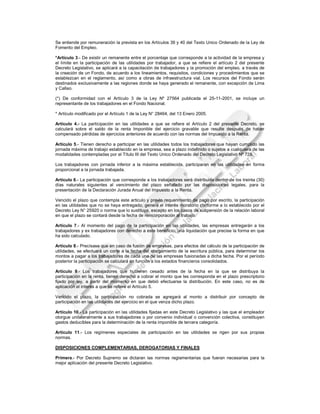 Este decreto legislativo regula el derecho de los trabajadores a participar en las utilidades de las empresas privadas que generan rentas de tercera categoría. Establece porcentajes específicos de participación en las utilidades para diferentes industrias, con un límite máximo de 18 remuneraciones mensuales por trabajador. También crea un fondo para capacitación y empleo con cualquier excedente restante, y entró en vigencia el 1 de enero de 1997.