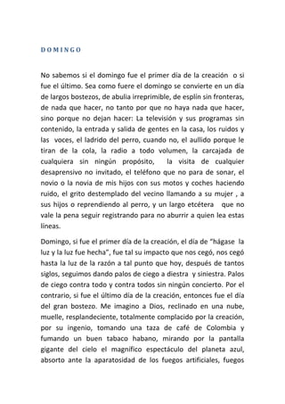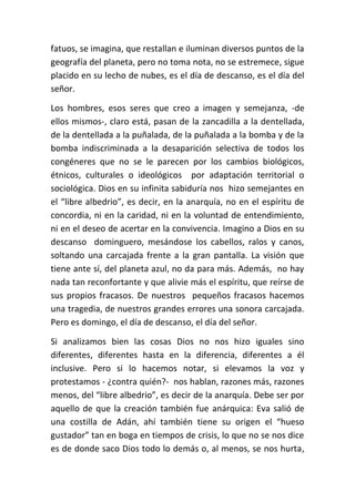 El domingo es un día de descanso pero también de ruidos y distracciones que no permiten descansar. Se plantea si el domingo fue el primer o último día de la creación y si fue el primer día, su impacto nos cegó hasta perder la razón. Si fue el último, imagina a Dios descansando complacido tras crear el mundo. Sin embargo, los seres humanos, creados a su imagen pero de sí mismos, pasan de la zancadilla a la violencia sin fin. Dios nos dio libre albedrío que es anarquía,