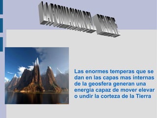 El documento describe los diferentes elementos que componen el relieve de la Tierra, incluyendo ríos, vertientes, montañas, mesetas y formas de costa. Explica que las fuerzas internas de la Tierra generan energía que mueve y deforma la corteza terrestre, dando lugar a la formación del relieve. También describe las principales vertientes y elementos de relieve en España, destacando la Meseta Española como una elevación central rodeada de sistemas montañosos.