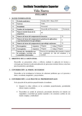 Este documento presenta el syllabus de la asignatura "Desarrollo del Pensamiento Nivelación" dictada en el Instituto Tecnológico Superior Vida Nueva. La asignatura dura 40 horas divididas en docencia, prácticas y aprendizaje autónomo. Los objetivos son desarrollar un pensamiento crítico y reflexivo mediante técnicas que fomenten las operaciones mentales básicas, y contribuir al perfil de egreso y prácticas preprofesionales de los estudiantes. La asignatura consta de 3