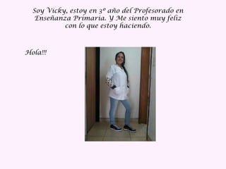 Vicky es una estudiante de tercer año del Profesorado de Enseñanza Primaria que se siente feliz con su carrera. Está casada con Claudio desde hace mucho tiempo y tienen dos hijas, Zoe y Guadalupe, a quienes ama a pesar de los desafíos que presentan ser madres.