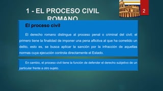 Este documento describe el derecho procesal romano y su evolución histórica. Explica que el derecho procesal regula el proceso a través del cual los sujetos de derecho pueden hacer valer sus derechos ante los órganos jurisdiccionales. Luego resume las tres etapas del proceso civil romano: 1) la venganza privada, 2) la justicia privada ante magistrados y jueces privados, y 3) la justicia pública donde el Estado asumió el control completo de la administración de justicia. Finalmente, detalla los