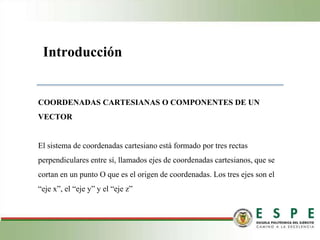 El documento explica el producto punto o producto escalar de dos vectores. Define el producto punto como una operación que da como resultado un número real, calculado como el módulo de los vectores multiplicado por el coseno del ángulo entre ellos. También se puede calcular como la suma de los productos de las coordenadas de cada vector. Se proveen ejemplos y ejercicios para ilustrar los conceptos.