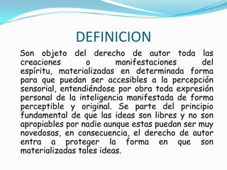 El documento define el derecho de autor como la protección de las creaciones originales del espíritu expresadas de forma perceptible. Explica las clases de derechos de autor, incluyendo derechos patrimoniales, morales, conexos y de reproducción. Los derechos patrimoniales permiten la explotación exclusiva de la obra por un tiempo limitado, luego pasa al dominio público. Los derechos morales son permanentes e irrenunciables. Los derechos conexos protegen a personas distintas al autor como artistas e intérpretes.