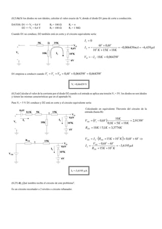 Este documento presenta tres ejercicios relacionados con circuitos electrónicos que incluyen transistores y diodos. El primer ejercicio describe un circuito recortador de dos niveles y calcula su característica de transferencia. El segundo ejercicio determina valores de resistencias para un circuito con dos transistores de modo que funcionen en un punto de operación específico. El tercer ejercicio calcula el valor de una resistencia para obtener una corriente deseada a través de otro resistor en un circuito con dos transistores.