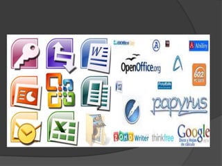 El documento describe los diferentes tipos de software de aplicación, incluyendo procesadores de texto, hojas de cálculo, sistemas de bases de datos y programas de comunicación. Específicamente, menciona Microsoft Word, Excel y PowerPoint como ejemplos comunes de aplicaciones de ofimática. También proporciona detalles sobre características y usos de procesadores de texto populares como Word, WordPad y Bloc de Notas.