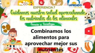 El documento explica cómo combinar los alimentos de manera saludable para aprovechar mejor sus nutrientes. Se menciona que Mercedes, una niña activa, se alimenta de varios grupos de alimentos como frutas, verduras y carnes. Al combinar alimentos de grupos diferentes como energéticos, constructores y protectores, se obtienen más nutrientes y energía para estar saludable.