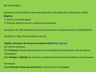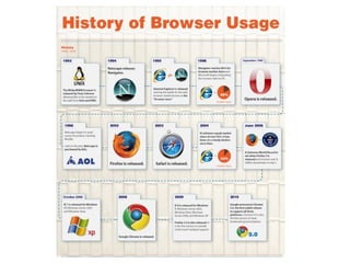 El documento describe la historia y evolución de los navegadores web y el Día de Internet. Comenzó con el desarrollo del primer navegador web por Tim Berners-Lee en 1991 y la creación de la World Wide Web en 1990. Posteriormente aparecieron navegadores populares como Mosaic, Netscape y Firefox, seguidos de Google Chrome, Internet Explorer, Opera y Safari. El 17 de mayo fue declarado Día Mundial de Internet para concienciar sobre su importancia.