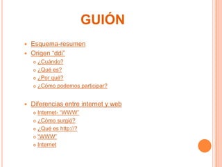 El documento habla sobre el Día de Internet. Explica que se celebra el 17 de mayo y fue establecido en 2005 por la Cumbre Mundial sobre la Sociedad de la Información para promover el uso de las tecnologías de la información. También diferencia entre Internet, que es una red de redes, y la World Wide Web (WWW), que es la parte visual de páginas web que combinan texto e imágenes.