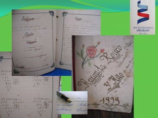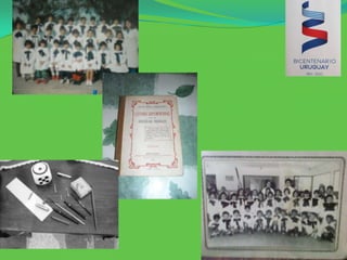 El documento describe las diferencias entre la educación pública uruguaya en el pasado y en la actualidad, destacando que antes los estudiantes se sentaban en bancos de madera, escribían con plumas y tinta en cuadernos de doble raya, llevaban sus útiles escolares en portafolios de cuero, y durante los recreos jugaban a diversos juegos tradicionales como la mancha, la escondida o la bolita, mientras que ahora la educación ha evolucionado y se ha modernizado.