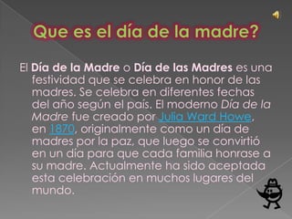 El Día de la Madre se celebra en honor a las madres en diferentes fechas según el país. Fue creado originalmente por Julia Ward Howe en 1870 como un día para que cada familia honre a su madre. Tiene sus orígenes en celebraciones de la antigua Grecia y Roma para honrar a deidades maternas y fue adoptado por los católicos para honrar a la Virgen María.