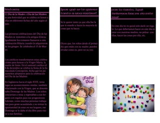 El poema celebra el amor incondicional de una madre, que apoya, confía, perdona y resiste por sus hijos incluso cuando nadie más lo hace. El documento luego explica que el Día de la Madre se originó en la antigua Grecia para honrar a las madres y se transformó en el catolicismo para honrar a la Virgen María. Actualmente, se celebra en diferentes fechas en diferentes países.