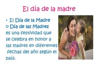 Este documento trata sobre el Día de la Madre, una festividad que se celebra en diferentes fechas según el país para honrar a las madres. Incluye frases de agradecimiento a las madres por su amor incondicional y su apoyo constante, así como poemas y pensamientos que resaltan lo especiales y dedicadas que son.