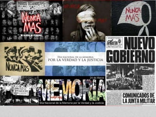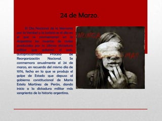 El documento habla sobre el Día Nacional de la Memoria por la Verdad y la Justicia en Argentina. Este día, el 24 de marzo, conmemora las muertes de civiles durante la última dictadura militar que gobernó el país entre 1976 y 1983. El 24 de marzo de 1976 se produjo el golpe de estado que derrocó al gobierno constitucional e inició la dictadura militar más sangrienta en la historia de Argentina.