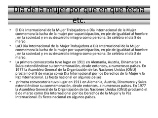 El Día Internacional de la Mujer se celebra el 8 de marzo para conmemorar la lucha de la mujer por la igualdad. La primera conmemoración ocurrió en 1911 en Alemania, Austria, Dinamarca y Suiza, y desde entonces se ha extendido a más países. En 1977, la ONU declaró el 8 de marzo como el Día Internacional de los Derechos de la Mujer y la Paz Mundial.