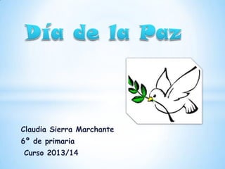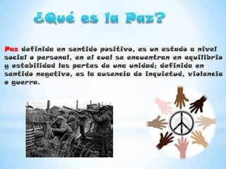 El documento proporciona definiciones de paz en sentido positivo y negativo. También menciona que el Día Escolar de la Paz y No Violencia se celebra el 30 de enero en memoria del asesinato de Mahatma Gandhi, un gran defensor de la paz. A continuación, presenta breves biografías de varios líderes pacifistas como Gandhi, Martin Luther King Jr., Madre Teresa, Yasir Arafat y Nelson Mandela.