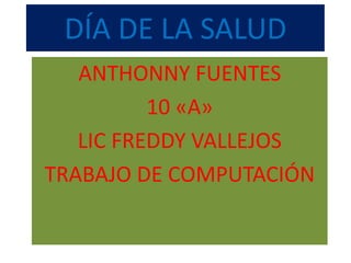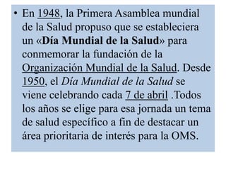 El documento habla sobre el Día Mundial de la Salud. Explica que desde 1950 se celebra cada 7 de abril para conmemorar la fundación de la Organización Mundial de la Salud. Cada año se elige un tema de salud específico como prioridad. En 2013, el tema fue la hipertensión, que afecta a mil millones de personas. El objetivo era reducir infartos e accidentes cerebrovasculares mediante la concientización sobre las causas y consecuencias de la hipertensión y alentando a la población a