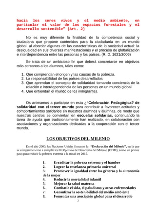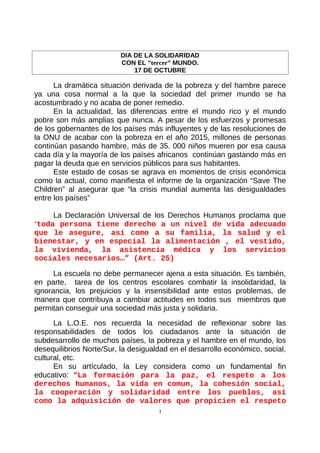 Este documento habla sobre el Día de la Solidaridad con el Tercer Mundo. Explica que a pesar de los esfuerzos internacionales, la pobreza y el hambre siguen siendo problemas graves que afectan a millones de personas. También menciona que las escuelas deben educar a los estudiantes sobre la responsabilidad global y fomentar actitudes de solidaridad.