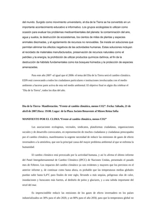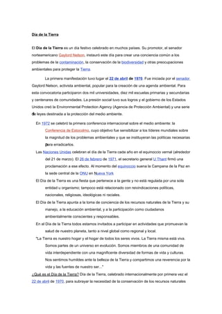 El Día de la Tierra es un día festivo celebrado internacionalmente cada 22 de abril para crear conciencia sobre problemas ambientales como la contaminación y la conservación de recursos naturales. Fue creado en 1970 por el senador estadounidense Gaylord Nelson y desde entonces se ha convertido en un importante evento educativo sobre temas ambientales.