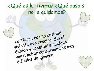 El documento describe el Día de la Tierra, celebrado el 22 de abril para rendir homenaje al planeta Tierra y reconocer su importancia como hogar de la humanidad. Explica que la Tierra es un sistema interdependiente cuya protección es crucial debido a que los ecosistemas como los bosques y ríos son esenciales para mantener la vida en el planeta. Además, proporciona algunos datos históricos sobre el origen y nombre oficial de este día.
