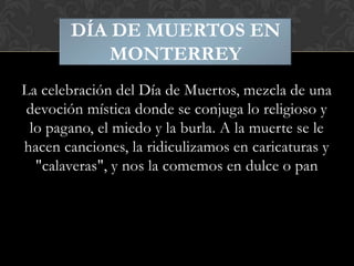 El documento habla sobre la tradición del Día de Muertos en Monterrey. Originalmente, la tradición no tenía mucho arraigo en Monterrey, pero en años recientes la Secretaría de Educación ha fomentado la construcción de altares de muertos en las escuelas para conservar la tradición mexicana. Además, la UNESCO ha reconocido al Día de Muertos como Patrimonio Oral e Intangible de la Humanidad.