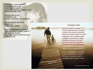 Este documento es una presentación sobre la importancia de los padres. Resalta que los padres son seres extraordinarios que siempre están ahí para escuchar y aconsejar a sus hijos. Incluye poemas que expresan el amor y gratitud hacia los padres. Recomienda valorar el tiempo con los padres y portarse bien para que ellos se sientan orgullosos, ya que los padres no son eternos.