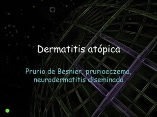 Este documento trata sobre la dermatitis atópica. Brevemente describe que es una manifestación cutánea de la atopia que se hereda de forma autonómica dominante y que puede expresarse clínicamente como eccema. Presenta cuadros clínicos que van desde lesiones agudas hasta crónicas con liquenificación. El tratamiento incluye medidas de control ambiental, tratamiento tópico con emolientes y corticoides, e intervenciones sistémicas como antihistamínicos.