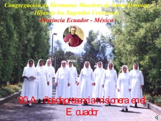 Este documento resume la historia y trabajo de la Congregación de Hermanas Maestras de Santa Dorotea Hijas de los Sagrados Corazones en Ecuador y México durante los últimos 80 años. Fue fundada en 1836 en Italia por el Beato Giovanni Farina para difundir la caridad de Jesús a través de obras educativas, asistenciales y pastorales. Actualmente tiene 26 comunidades en Ecuador y 3 en México donde imparten educación, brindan asistencia médica y realizan trabajo pastoral y de evangelización.
