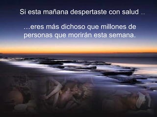 1) Insta al lector a dar gracias si tiene salud, comida, ropa y un techo, ya que muchos no tienen estas cosas básicas. 2) Cita varias estadísticas para ilustrar cuán afortunado es el lector al poder leer y tener recursos financieros en comparación con miles de millones de personas. 3) Finalmente, cita varios pensamientos que enfatizan cómo la gratitud mejora la fel